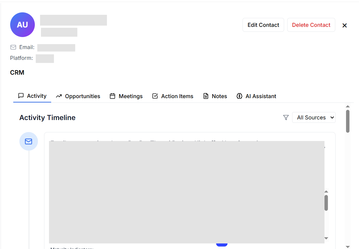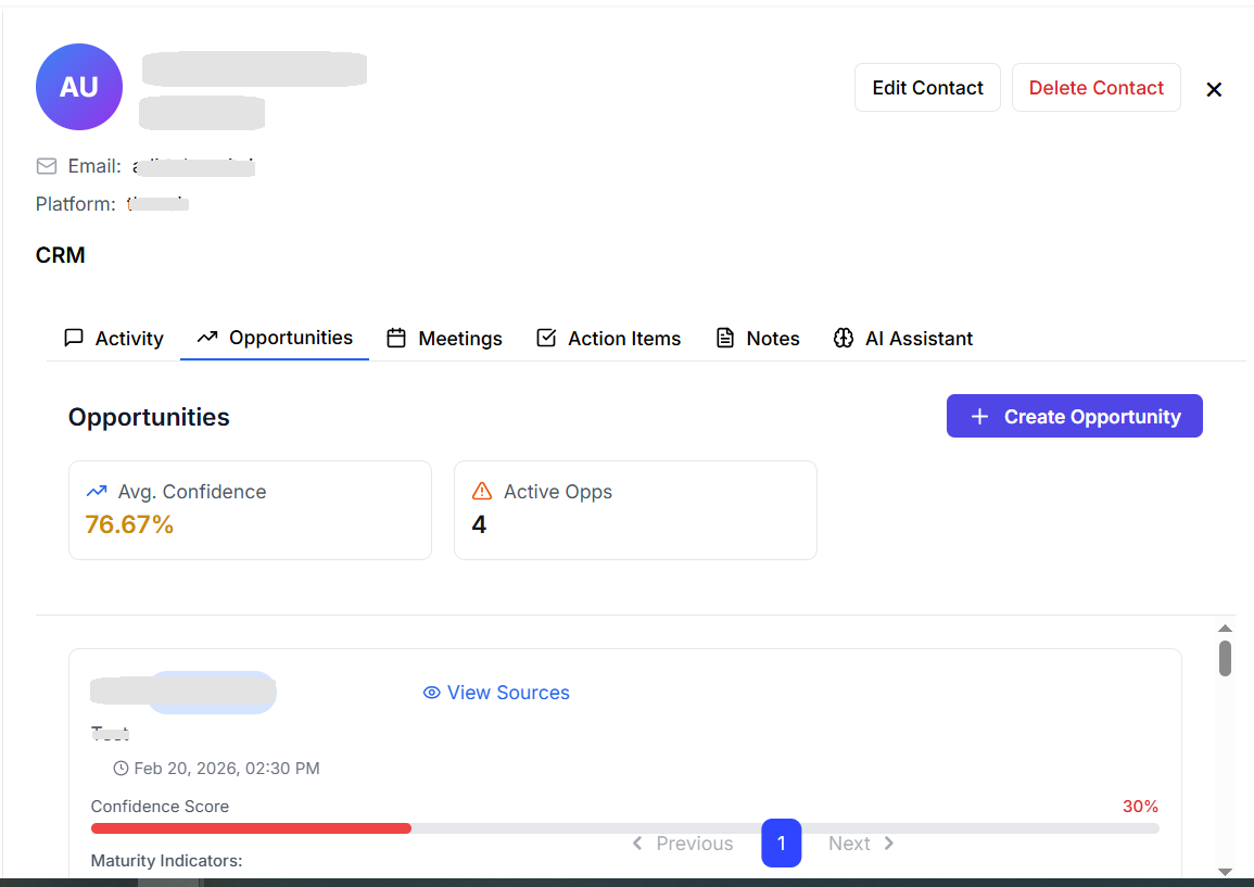 | Opportunities | View AI-detected sales opportunities and analyze them with maturity indicators and confidence tags. |