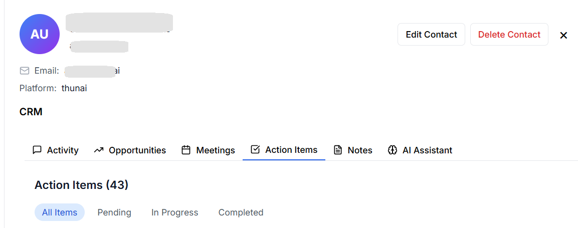 Action items that has been captured from any interaction with this contact, through different mediums Like Calls , Emails , is been listed here.
