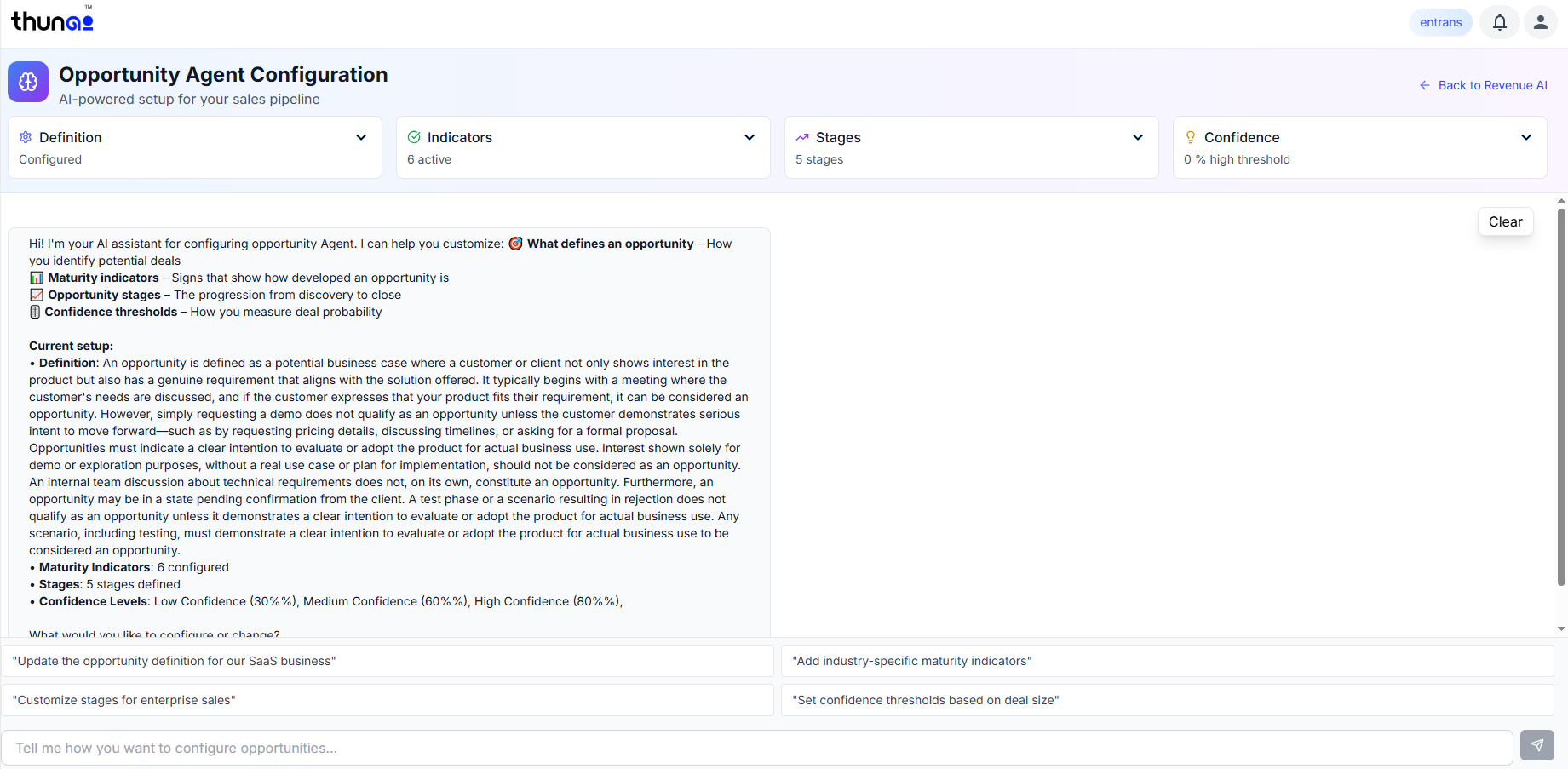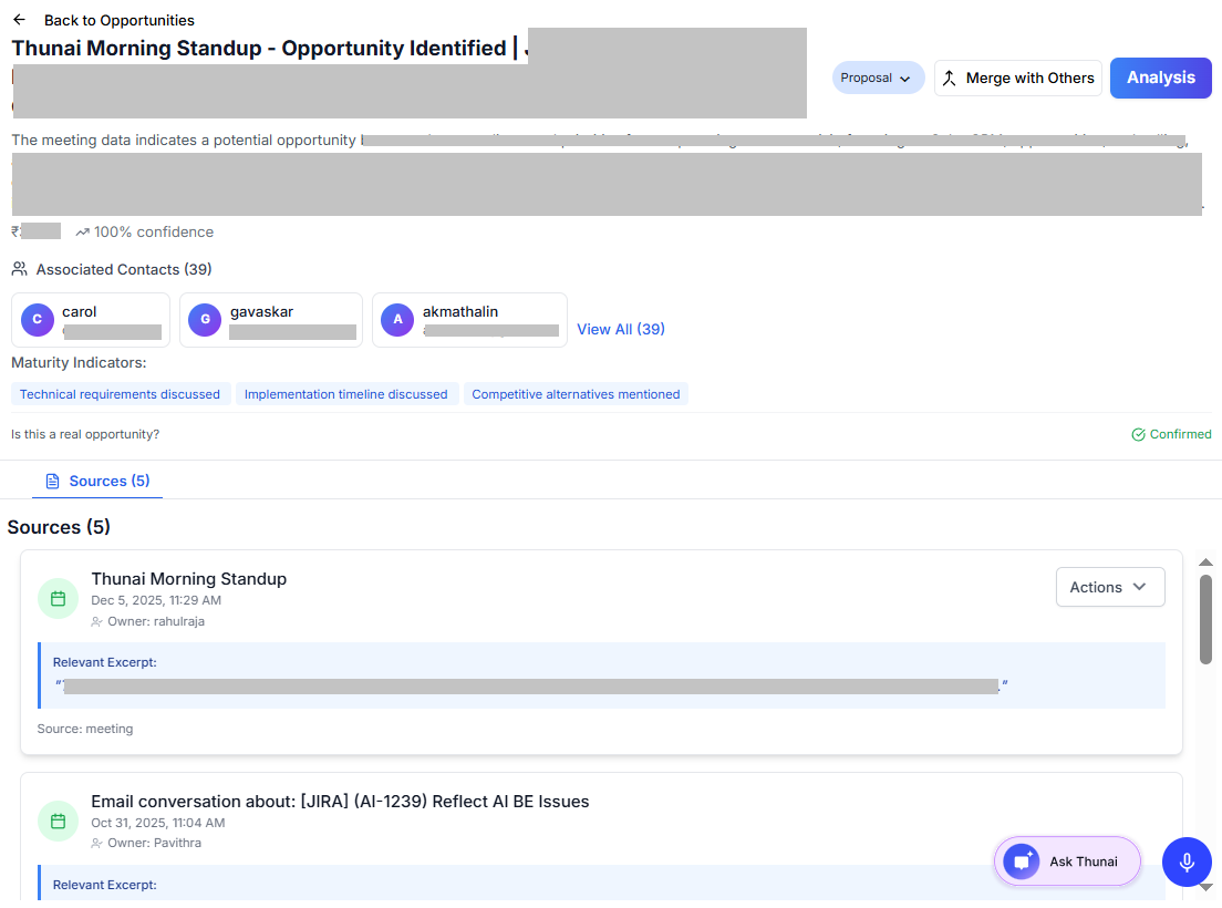 Thunai Revenue AI helps you manage your contacts, track and analyze opportunities, and configure opportunity detection rules based on meetings and email activity. With AI-driven tagging, confidence scoring, and smart domain filtering, Thunai Revenue AI streamlines the relationship management and sales discovery process across your organization.