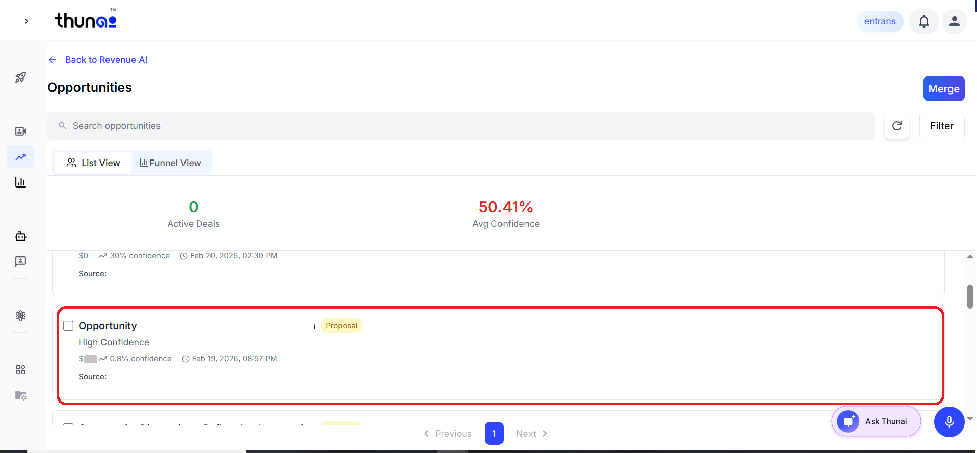 Each stage includes an Ask Thunai option, which provides AI-powered summaries of the opportunities in that stage.