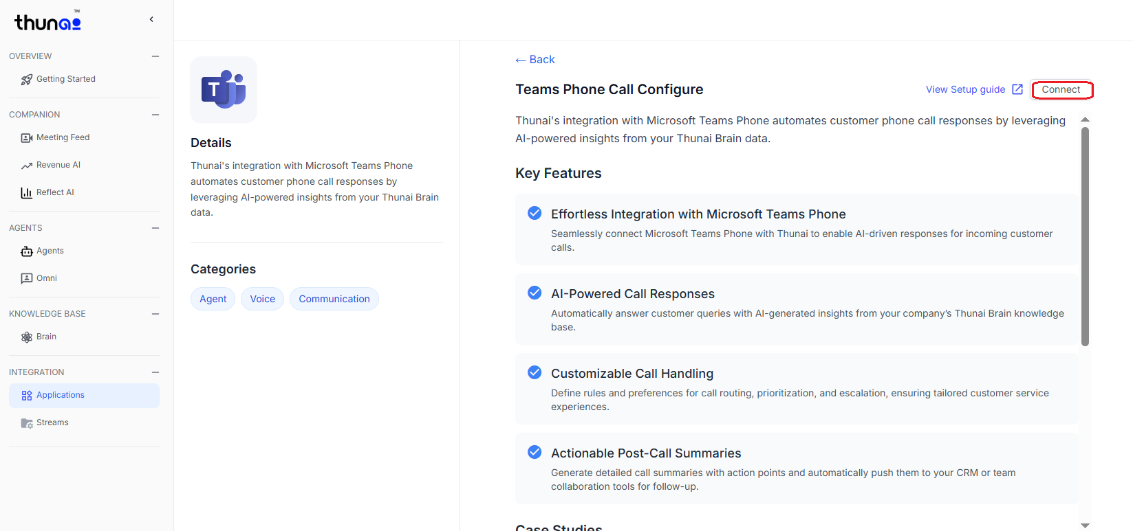 The Teams Phone Call Integration in Thunai allows users to make and manage phone calls directly through Microsoft Teams, while leveraging the power of Thunai's AI-driven workflow automation. This integration seamlessly bridges the gap between communication channels and business operations, enabling a streamlined experience for teams, particularly those in sales, support, and customer success.